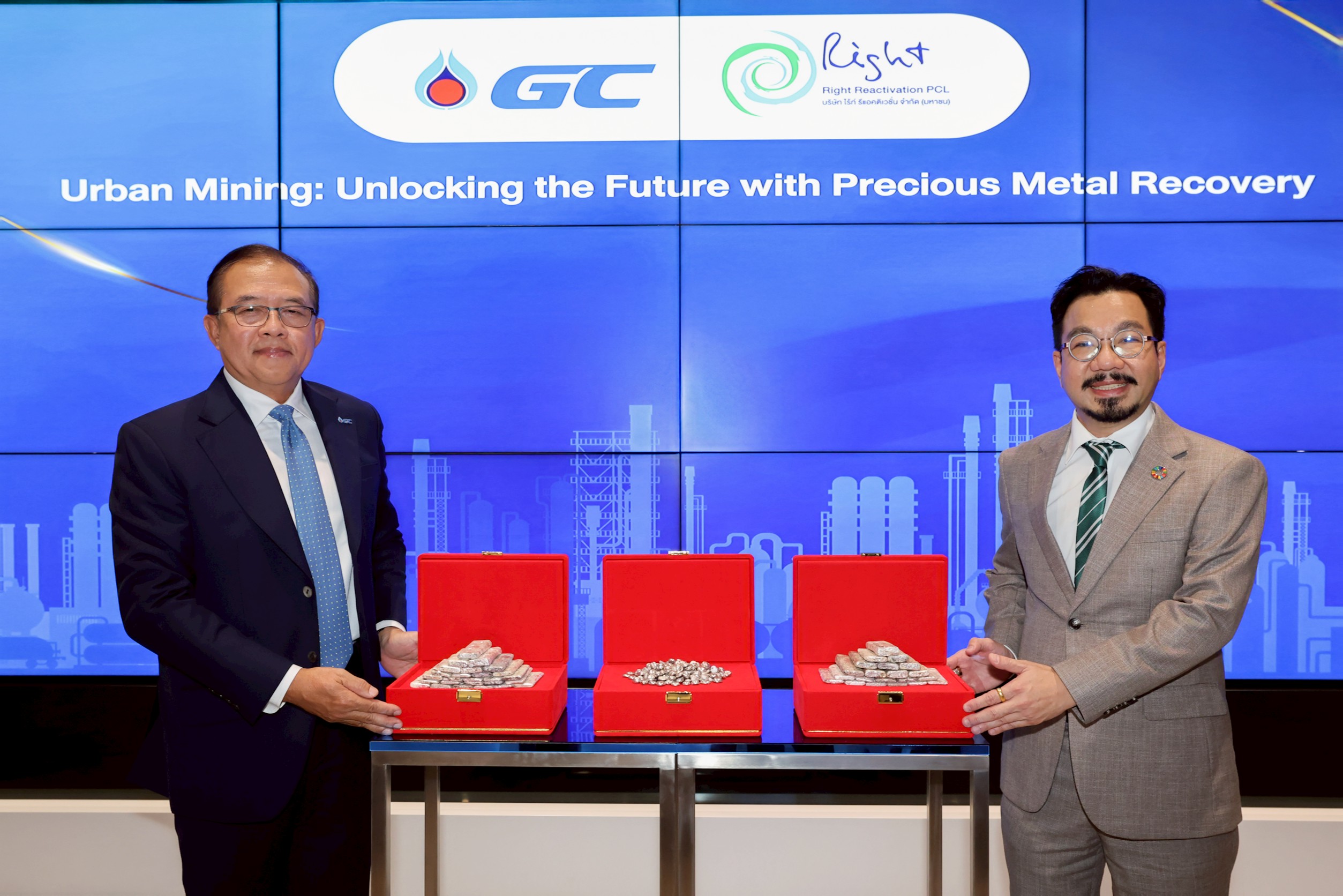 ภายในงาน “Urban Mining: Unlocking the Future with Precious Metal Recovery” ได้มีพิธี ส่งมอบโลหะมีค่าที่สกัดได้จากตัวเร่งปฏิกิริยาใช้แล้วอย่างเป็นทางการ ซึ่งสะท้อนถึงความก้าวหน้า ในการจัดการทรัพยากรอย่างยั่งยืนของภาคอุตสาหกรรมไทย ความสำเร็จครั้งนี้เป็นอีกหนึ่งตัวอย่าง ของ GC StandOut ที่กล้าคิด กล้าทำสิ่งใหม่ๆ เพื่อสร้างความแตกต่างอย่างยั่งยืนในทุกมิติของธุรกิจ ไม่เพียงสร้างความได้เปรียบในการแข่งขัน แต่ยังขับเคลื่อนให้ GC มุ่งสู่ธุรกิจมูลค่าสูง คาร์บอนต่ำ และเติบโตอย่างยั่งยืน