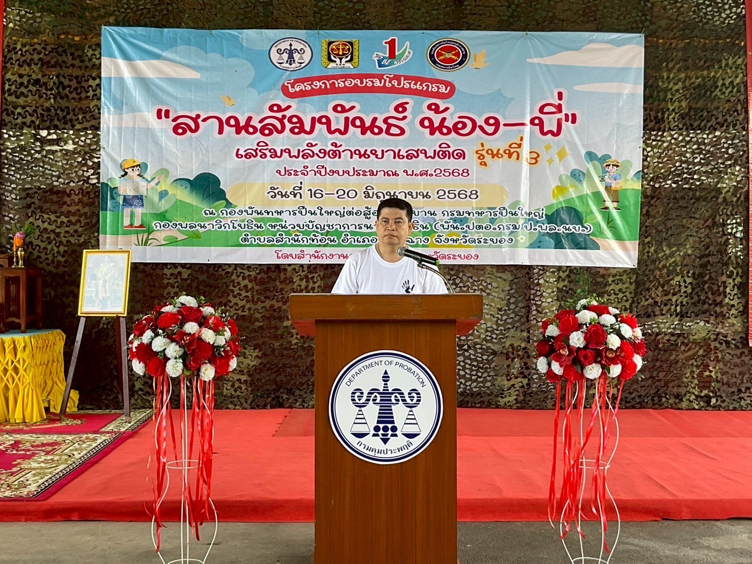 เมื่อวันที่ 17 พฤษภาคม 2568 กรมคุมประพฤติ กระทรวงยุติธรรม โดยสำนักงานคุมประพฤติจังหวัดระยอง จัดพิธีเปิดโครงการอบรมโปรแกรม “สานสัมพันธ์น้อง-พี่ เสริมพลังต้านยาเสพติด” รุ่นที่ 3 ประจำปีงบประมาณ พ.ศ. 2568 โดยมีนางสาวสุพิชชา พันทิอั้ว ผู้อำนวยการสำนักงานคุมประพฤติจังหวัดระยอง เป็นประธานในพิธีเปิด