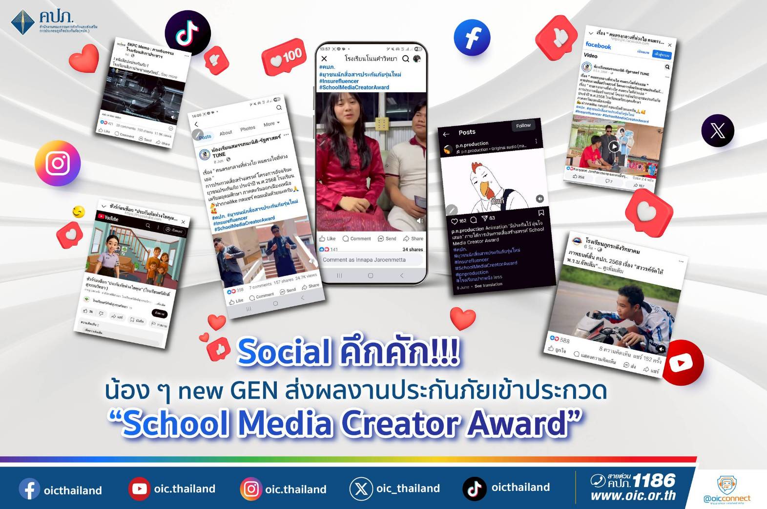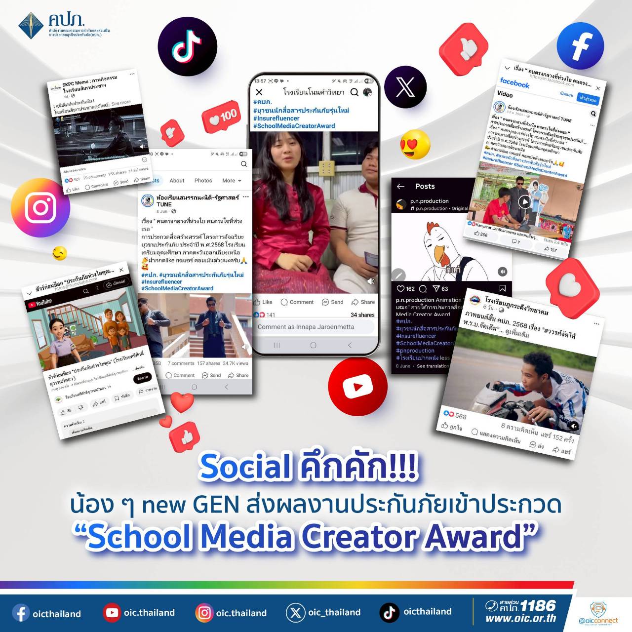 สำนักงานคณะกรรมการกำกับและส่งเสริมการประกอบธุรกิจประกันภัย (สำนักงาน คปภ.) เปิดเผยความคืบหน้าโครงการ ส่งผลงานประกันภัยเข้าประกวด “School Media Creator Award” โดยเป็นคลิปวีดีโอสั้นที่มีเนื้อหาเกี่ยวกับการประกันภัย ที่มีรูปแบบที่หลากหลาย น่าสนใจ ซึ่งสามารถติดตามผลงานสื่อสร้างสรรค์นี้บนบทความช่องทางแพลตฟอร์มออนไลน์เพียงพิมพ์ Hashtag #คปภ. #ยุวชนนักสื่อสารประกันภัยรุ่นใหม่ #Insurefluencer #SchoolMediaCreatorAward ซึ่งปัจจุบันกำลังได้รับความนิยมอย่างแพร่หลายและถูกพูดถึงในสื่อโซเซียลขณะนี้ โดยผลงานจะมีกำหนดปิดนับยอด View ในวันที่ 18 กรกฎาคม 2568 ดังนั้น จึงขอเชิญชวนชาวโซเซียลติดตามและเป็นกำลังใจให้น้อง ๆ new GEN ไปด้วยกัน