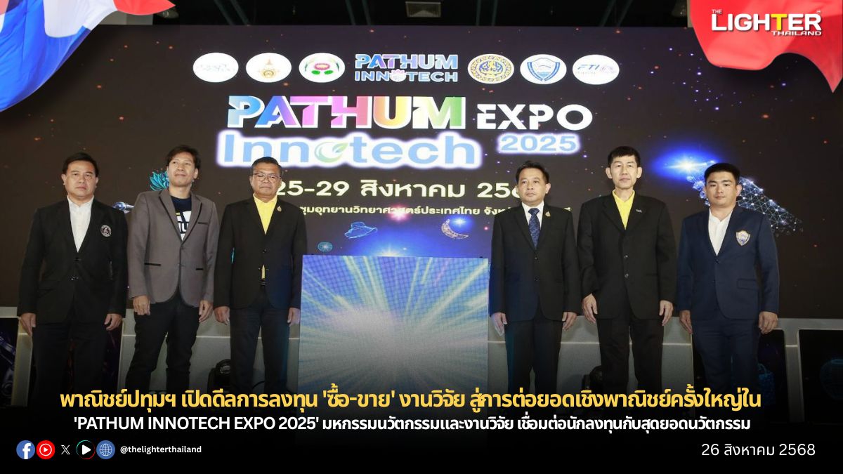 นักลงทุน ผู้ประกอบการ และผู้ที่สนใจงานนวัตกรรมเพื่อต่อยอดเชิงธุรกิจ สามารถเข้าร่วมชมงาน PATHUM INNNOTECH EXPO 2025 ได้ ระหว่างวันที่ 25-29 สิงหาคม 2568 ณ ศูนย์ประชุมอุทยานวิทยาศาสตร์ประเทศไทย ตำบลคลองหนึ่ง อำเภอคลองหลวง จังหวัดปทุมธานี หรือสอบถามข้อมูลเพิ่มเติมได้ที่ สำนักงานพาณิชย์จังหวัดปทุมธานี โทรศัพท์ 0-2567-0224