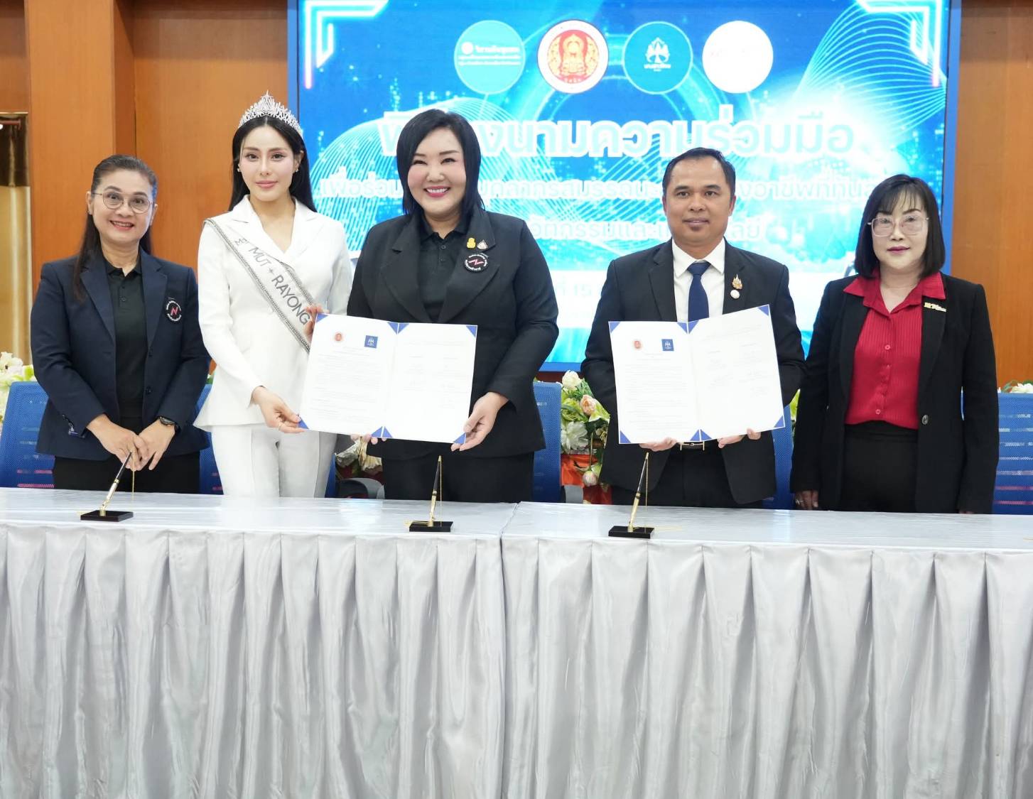 เมื่อวันที่ 15 ต.ค.68 ที่ห้องประชุมสัมมนาอาชีวศึกษา ชั้น 3 ตึกอำนวยการ วิทยาลัยเทคนิคระยอง นายกิตติพงค์ อุตตมะเวทิน ผู้อำนวยการวิทยาลัยเทคนิคระยอง พร้อมด้วยนางณัฐธารีย์ สิริกุลปัญญาพร รองผู้อำนวยการฝ่ายแผนงานและความร่วมมือ นายชาคริต รุ่งรัตน์ รองผู้อำนวยการฝ่ายวิชาการ และหัวหน้าแผนกวิชา ได้ร่วมลงนามบันทึกข้อตกลงความร่วมมือ (MOU) ร่วมกับหน่วยงานและองค์กรภาคีเครือข่ายจำนวน 2 แห่ง ได้แก่ สถาบันการสร้างชาติ EEC รุ่นที่ 9 กลุ่มประเทศชิลี และวิสาหกิจชุมชนกลุ่มแม่บ้านเกษตรกรบ้านสะพานหิน ภายใต้โครงการ ‘พริกตุ้มระยองยั่งยืน’ มีวัตถุประสงค์ เพื่ออนุรักษ์พันธุ์พริกตุ้มไม่ให้สูญหายจากจังหวัดระยอง สร้างการเรียนรู้และการฝึกปฏิบัติร่วมกันระหว่างชุมชนกับนักศึกษาวิทยาลัยเทคนิคระยอง รวมทั้งส่งเสริมการเกษตร สร้างอาชีพ และเพิ่มรายได้ให้กับคนในชุมชน โดยมีนางนันท์นพร สุสา ประธานคณะ CNB (Corporate Nation Building) สถาบันการสร้างชาติ EEC รุ่นที่ 9 กลุ่มประเทศชิลี เป็นผู้ลงนาม โดยมีนายธนเสฏฐ์ ภูวกาญจนาลัย ประธานคณะประชาสัมพันธ์ สถาบันการสร้างชาติ EEC รุ่นที่ 6 กลุ่มประเทศชิลี และน.ส.ปรานี จิตติรบำรุง ตัวแทนวิสาหกิจชุมชนกลุ่มแม่บ้านเกษตรกรบ้านสะพานหิน ลงนามเป็นพยาน และลงนามกับองค์กรนางสาวไทยระยอง เพื่อดำเนินกิจกรรมส่งเสริมบุคลิกภาพ และการอนุรักษ์ ‘ผ้าตากะหมุก’ ผ้าพื้นเมืองประจำจังหวัดระยอง โดยมีคุณจีระนันท์ พ้องเสียง ผู้อำนวยการกองประกวดนางสาวไทย ระยอง และนักศึกษาสถาบันการสร้างชาติ EEC รุ่นที่ 9 กลุ่มประเทศสโลวาเกีย เป็นผู้ลงนาม และมีนางภฤศ หอมสนิท นักศึกษาสถาบันการสร้างชาติ EEC รุ่นที่ 9 กลุ่มประเทศชิลี และน.ส.วรดา ฉัตรศรี Miss Universe Rayong 2023 ลงนามเป็นพยาน