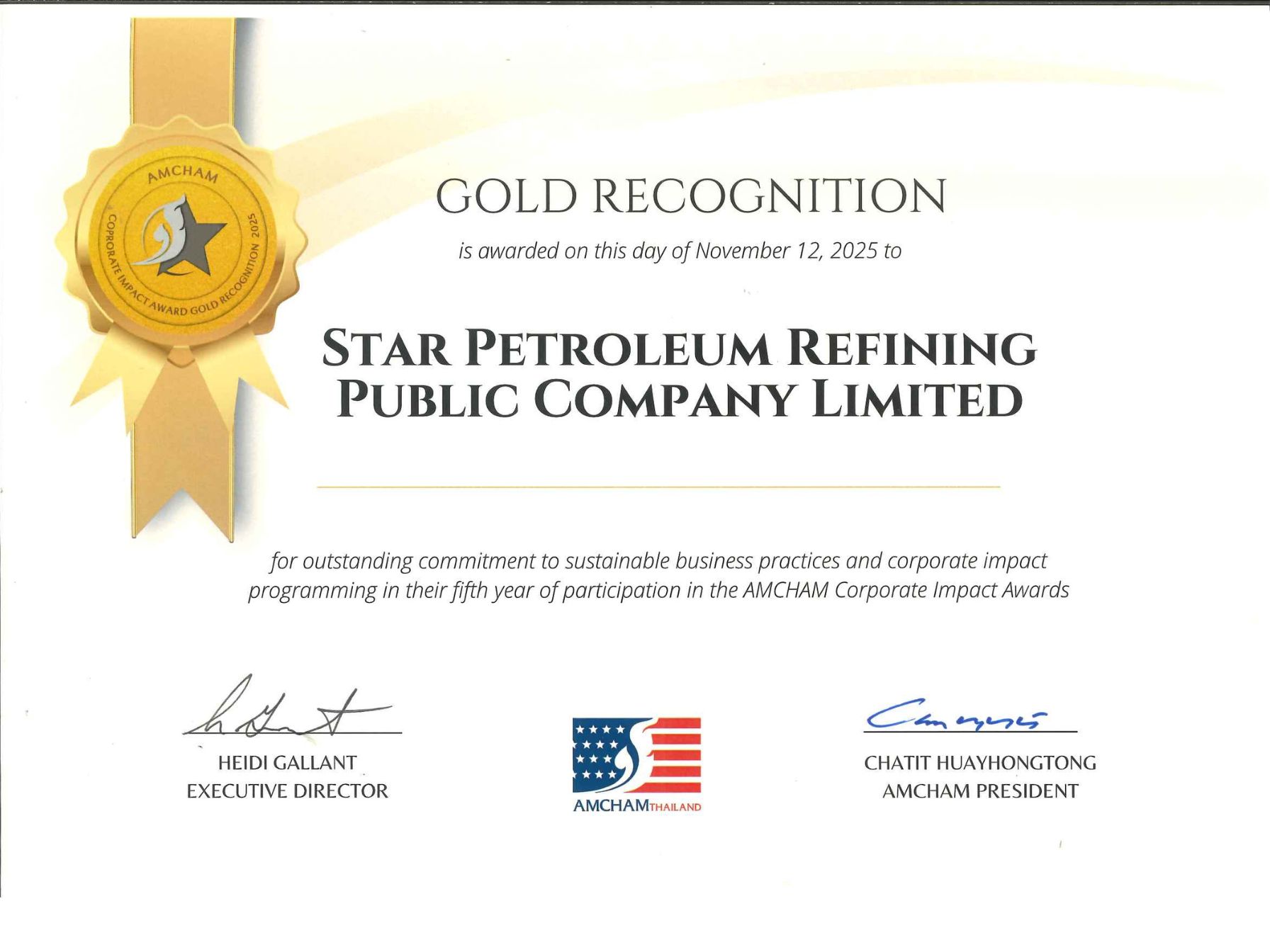 บริษัท สตาร์ ปิโตรเลียม รีไฟน์นิ่ง จำกัด (มหาชน) หรือ SPRC ได้รับรางวัล “AMCHAM Corporate Social Impact Award ประจำปี 2568” จาก หอการค้าอเมริกันในประเทศไทย (AMCHAM) ต่อเนื่องเป็นปีที่ 5 โดยในปีนี้ SPRC ได้รับการยกย่องในระดับทอง (Gold Level) ซึ่งเป็นการยกระดับจากปีที่ผ่านมา ที่ได้รับรางวัลในระดับเงิน (Silver Level) สะท้อนถึงความโดดเด่นและความมุ่งมั่นในการดำเนินงานด้านความรับผิดชอบต่อสังคมและสิ่งแวดล้อมอย่างต่อเนื่องและเป็นรูปธรรม
