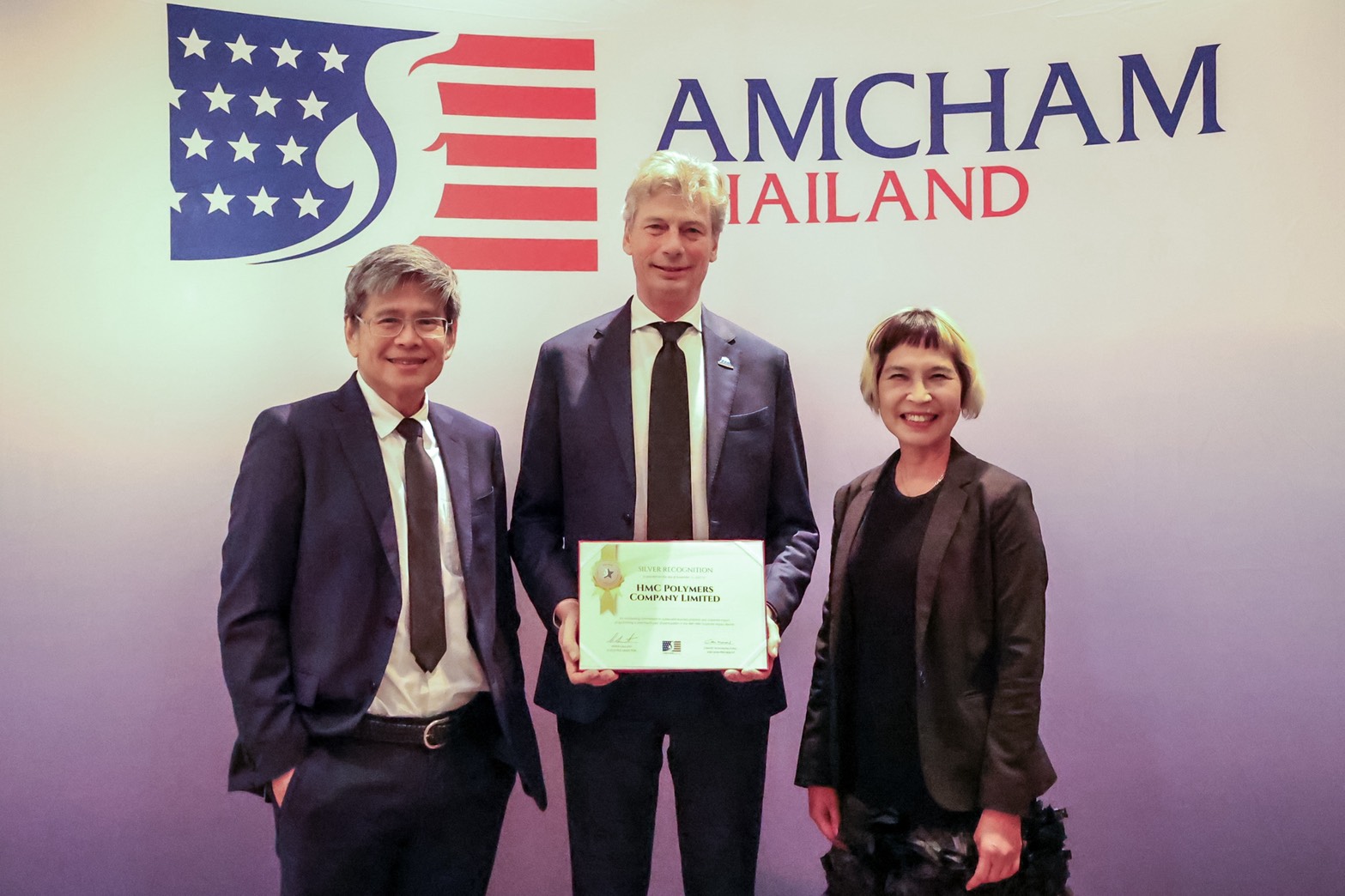 คุณคอร์โซ อูซีลลี่ ประธานบริษัท เอ็ชเอ็มซี โปลีเมอส์ จำกัด พร้อมด้วย คุณวสันต์ ทรัพย์เอนก รองประธานอาวุโสสายงานการผลิตและปฏิบัติการเพื่อความเป็นเลิศ และ คุณบุปผาพรรณ พานทอง ผู้จัดการฝ่ายกิจการเพื่อความรับผิดชอบต่อสังคม รับรางวัล AMCHAM Corporate Impact 2025 (Silver Level) ที่มีผลการดำเนินงานด้านความรับผิดชอบต่อสังคมต่อเนื่องตลอดระยะเวลา 4 ปี จากสภาหอการค้าอเมริกันในประเทศไทย (AMCHAM Thailand) ในฐานะองค์กรที่สร้างคุณประโยชน์ต่อสังคมไทยและสิ่งแวดล้อม โดยมีคุณโรเบิร์ต โกเดด เอกอัคราชฑูตสหรัฐอเมริกาประจำประเทศไทย คุณแคทเธอรีน สปิลแมน อัครราชทูตที่ปรึกษาประจำสถานทูตสหรัฐอเมริกาประจำประเทศไทย และคุณไซมอน เดนนี กรรมการบริหารหอการค้าอเมริกันในประเทศไทยและผู้ประสานงานคณะกรรมการ Corporate Social Impact เป็นผู้มอบรางวัล ณ โรงแรม นิกโก้ กรุงเทพฯ