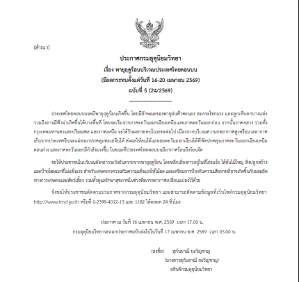 กรมอุตุนิยมวิทยา ออกประกาศเตือน พายุฤดูร้อนบริเวณประเทศไทยตอนบน (ฉบับที่ 5) มีผลกระทบช่วงวันที่ 16–20 เมษายน 2569 โดยหลายพื้นที่จะเผชิญฝนฟ้าคะนอง ลมกระโชกแรง และลูกเห็บตกบางแห่ง รวมถึงเสี่ยงฟ้าผ่า
